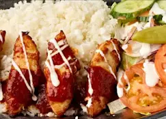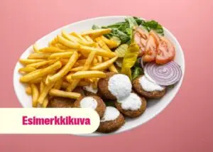 Ranskalaisia, riisiä, falafelia, sitruunaa, salaattia, sipulia, tomaattia ja jalapenoa