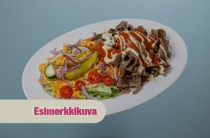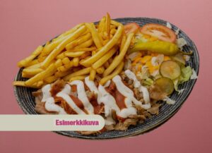 Kebablihaa ja kasviksia pitaleivän välissä. Tarjoillaan ranskalaisten perunoiden kanssa