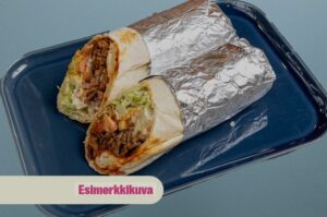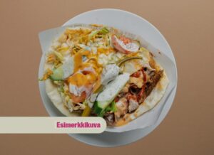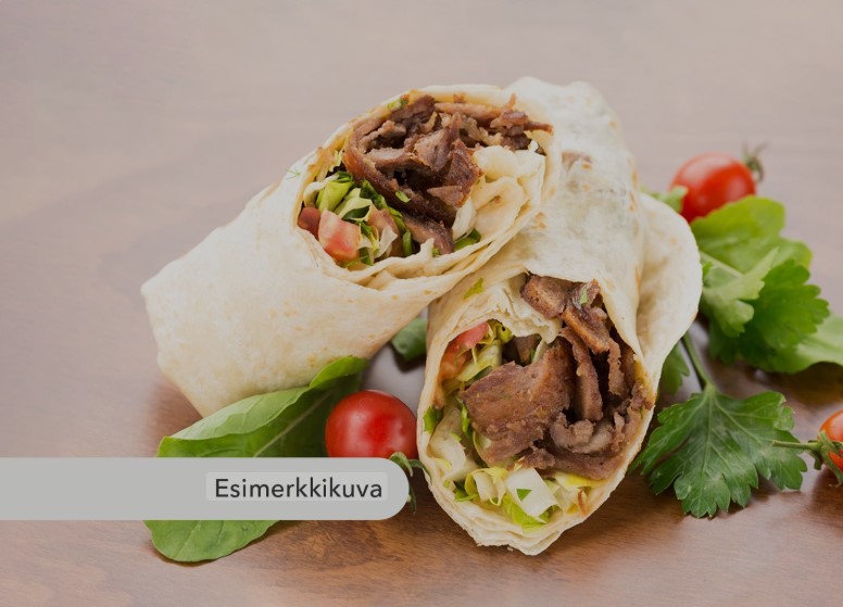 Kebablihaa ja erilaisia kasviksia ohuen leipärullan sisällä. Tarjoillaan ranskalaisten kanssa